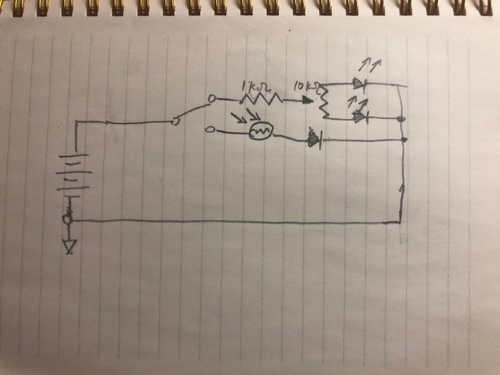 1. One LED popped. I was trying to set up LED that controlled by light dependent resistance. I wired the resistance to the same row, so the flow didn’t go through it (it went through the grid, which has lower resistance). Solved by wiring to a different row.